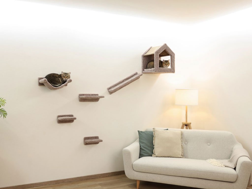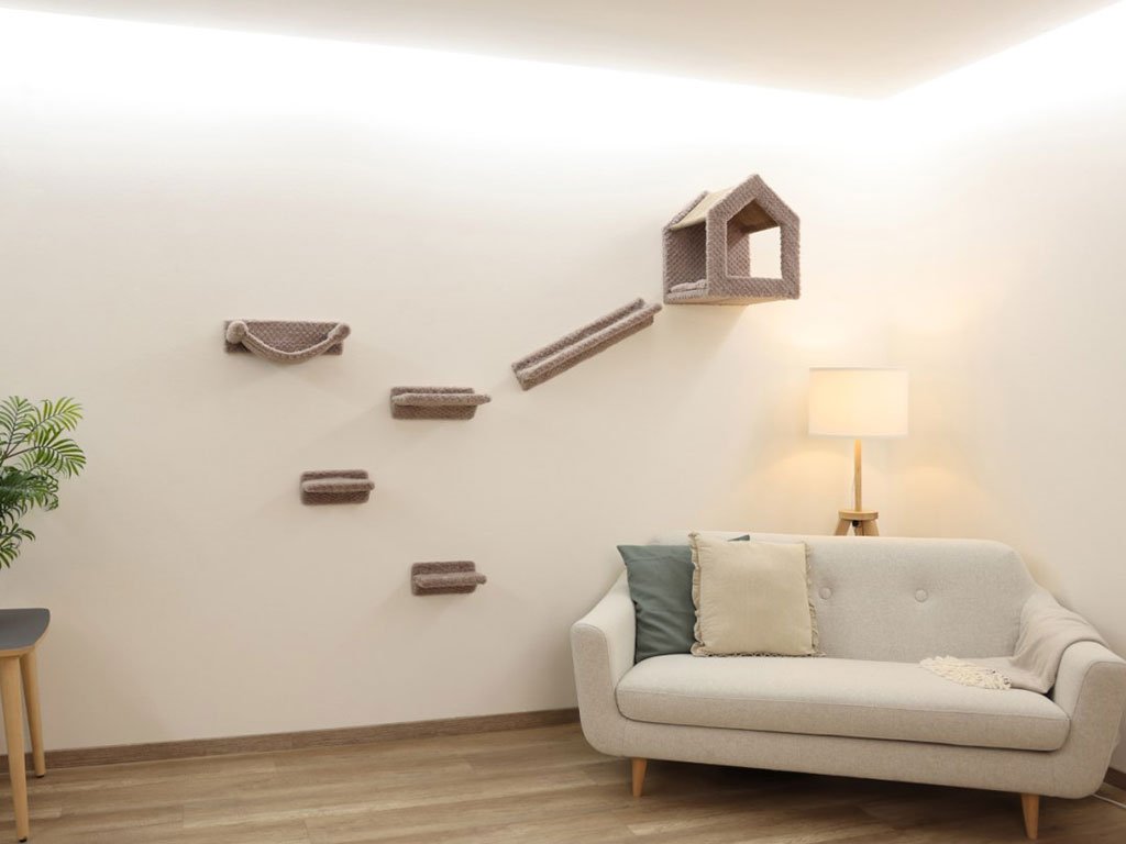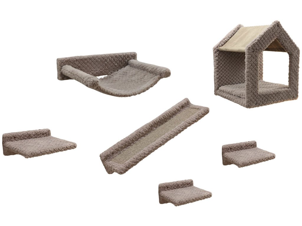 Kočičí strom na zeď, sada šesti částí, montáž na stěnu podle individuálních prostorových možností, útulný domeček, dvě stupačky, terasová deska, rampa a houpací síť, nosnost 10 kg.