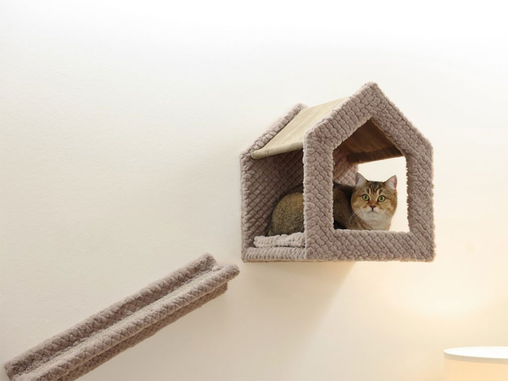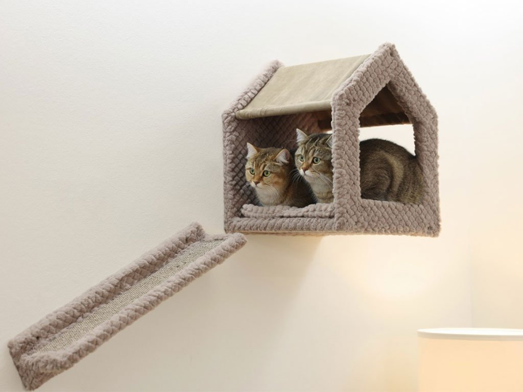 Kočičí strom na zeď se skládá celkem ze šesti částí, které můžete podle svých individuálních prostorových možností namontovat na zeď, díly k ukotvení do zdi jsou součástí balení. Kočičí strom obsahuje prostorný domeček 38x38x45 cm, dvě stupačky pro lezení 23x14 cm, terasovou desku 31x21 cm, houpací síť 39x27 cm a rampu se sisalovým kobercem s rozměry 58x14 cm. Všechny ostatní části jsou potaženy měkkým plyšem z polyesteru.