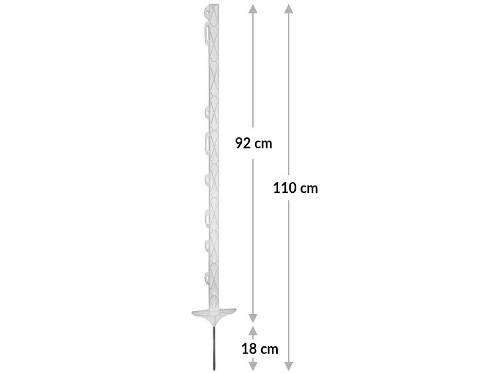 Plastový sloupek, pro elektrický ohradník, vysoce kvalitní plast, vhodné použití i v mrazech, využití pro dráty, pásky, lanka, dvojitý nášlap, pozinkovaný hrot, délka hrotu 18 cm, celková délka 110 cm.