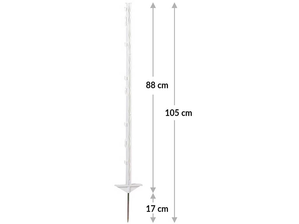 Plastový sloupek, pro elektrický ohradník, využití pro dráty, pásky, lanka, dvojitý nášlap, pozinkovaný hrot, délka hrotu 17 cm, celková délka 105 cm.