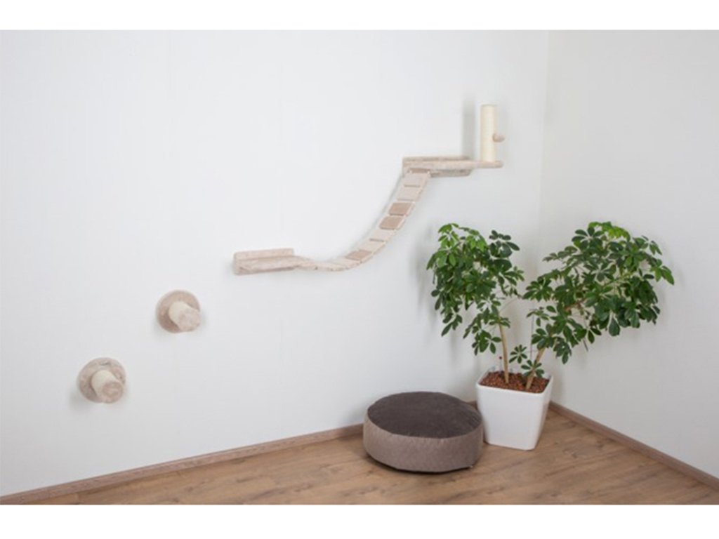 Škrabadlo pro kočky, béžové, sada šesti částí, montáž na stěnu podle individuálních prostorových možností, dva sisalové válečky, stupačka, visutý most, polstrovaná deska na ležení a sisalový sloup s míčkem, nosnost 6 kg.