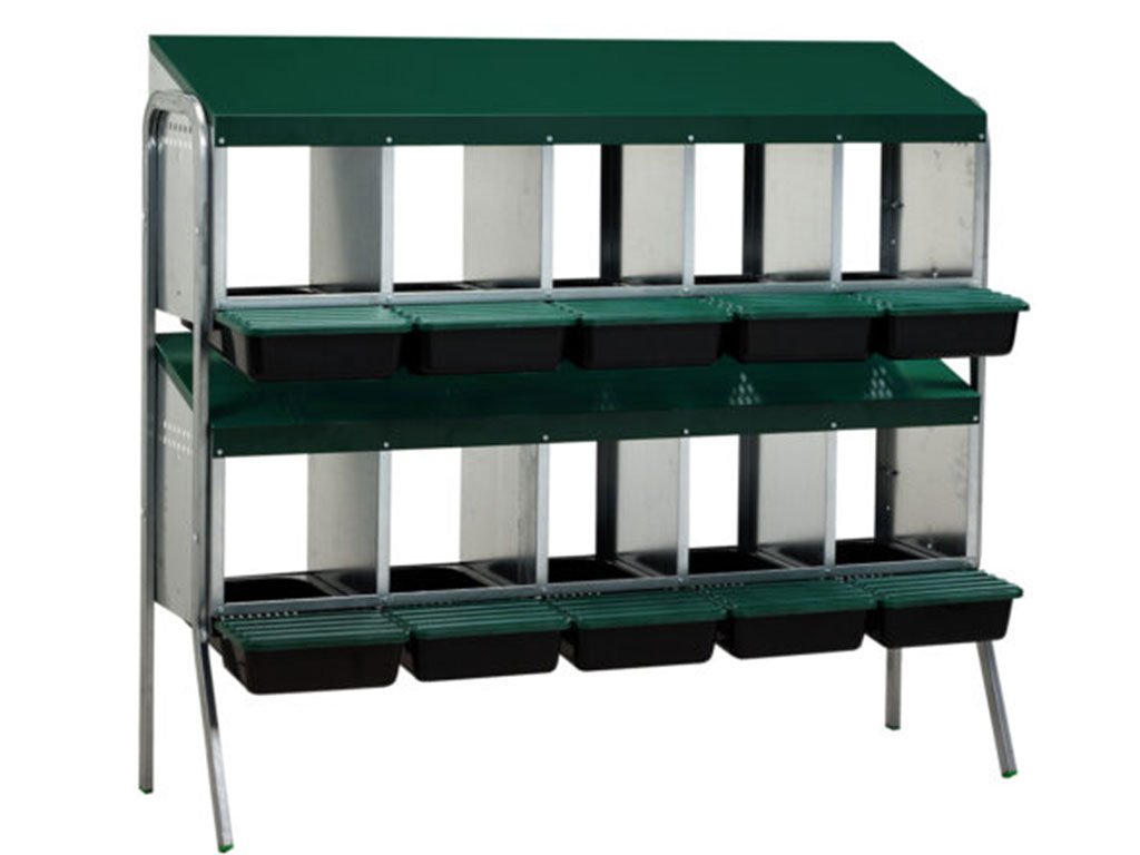 Snáškové hnízdo pro slepice se sběrným košíkem na vejce 10-místné na nožičkách, kapacita až 50 nosnic (5 nosnic na jednu kukaň), dno hnízda je spádované, vejce se samo odkutálí do sběrného košíku, vyrobené z pozinkovaného kovu s plastovým dnem, barva zelená. Hnízdo můžete jednoduše postavit v kurníku na zem, velice snadná údržba čistoty, rozměry: 52,5 cm délka x 132,5 cm šířka x 121 cm výška.