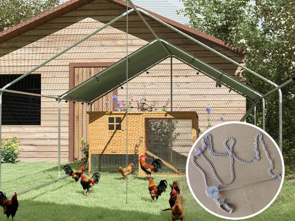 Výběh pro drůbež pozinkovaný, vhodný pro 18-24 slepic, prostorný o rozloze 18 m2, odolné šestihranné pletivo, ochranná plachta před UV zářením a deštěm, praktická krmná dvířka, závěsný krmný řetěz a víceúrovňové bidlo, velká vstupní branka, celkové rozměry 300x600x195 cm.
